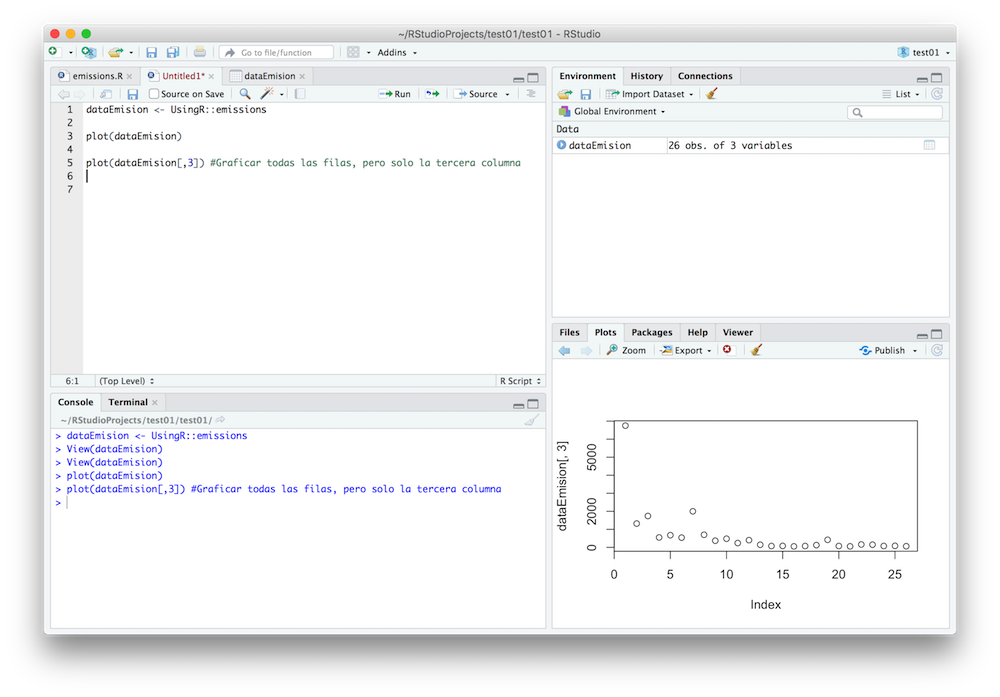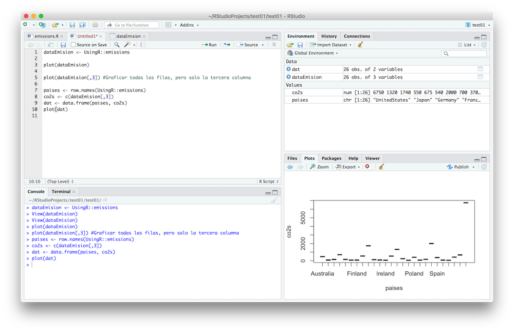 Como ya tenemos la data en la variable “dataEmision”, podemos usarla para realizar diferentes acciones, como por ejemplo graficarlas directamente con los siguientes comandos:
