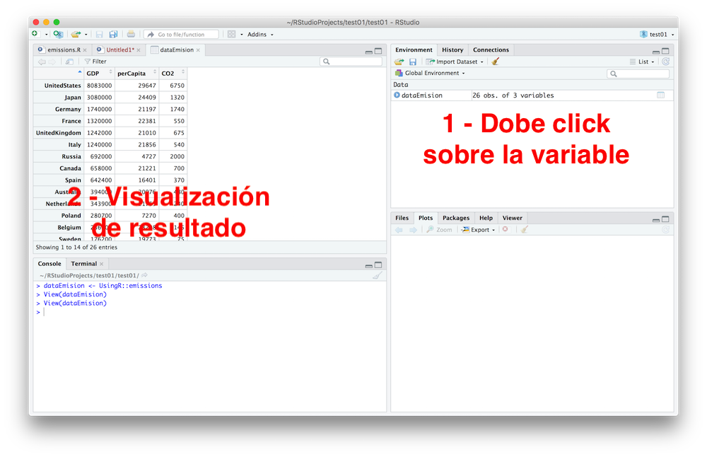 En este ejemplo usaremos la data de “emissions”, que contiene una grilla con la data del PIB y las emisiones de CO2 de 22 países en 1999.